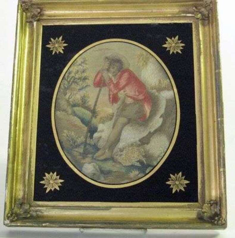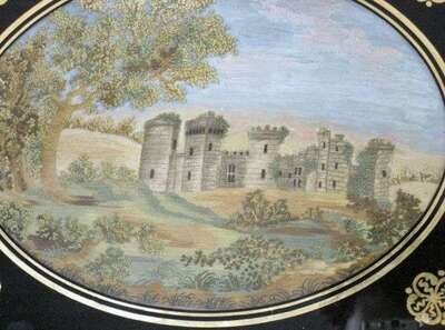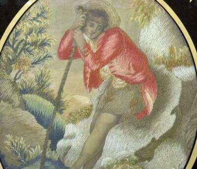 Depicting a shepherd standing in a stream, worked in various shades of red, pink ,cream, brown, green, and blue; together with a companion needlework depicting a castle.