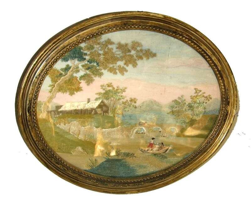 Riverscape with bridge and boat, worked with silk and chenille threads and heightened with watercolor on a silk ground, oval format, gilt frame.
