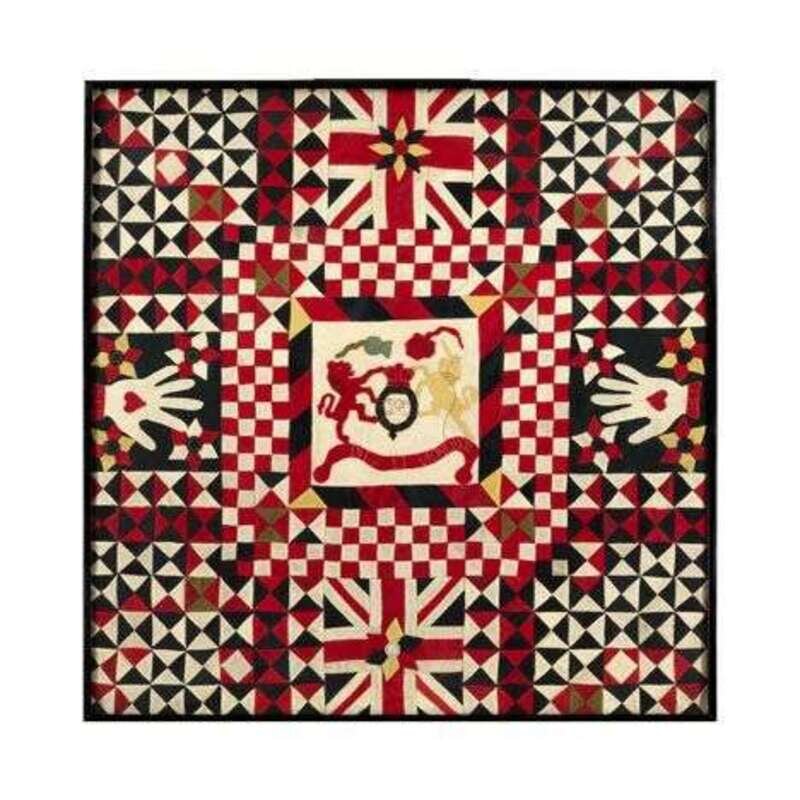 Wool pieces in red, white, blue, green and yellow arranged in geomteric design centering Royal Coat of Arms flanked by heart in hands and foliate devices and flags, framed.
