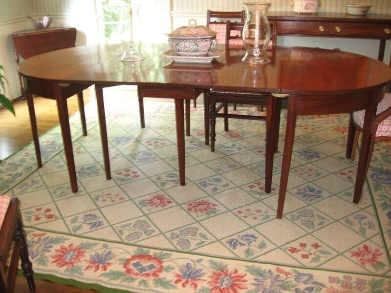 WIth two demilune shaped ends on square tapering legs, with center drop leaf.