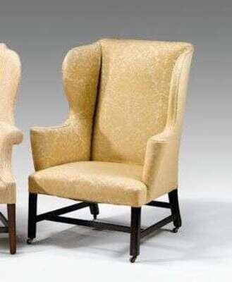 The flat crest flanked by shaped wings continuing to outscrolling arms above a trapezoidal seat fitted with a conforming cushion, on straight legs fitted with casters joined by H-stretchers.