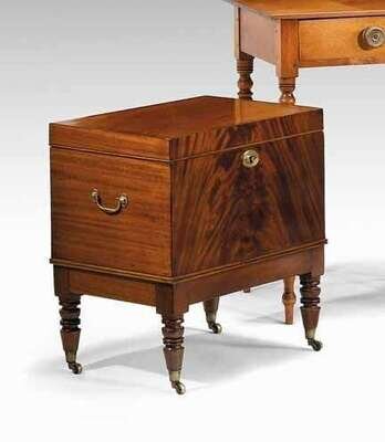 Hinged top with rosewood cross banding opend to fitted interior, on straight skirt and turned legs ending in pad feet.