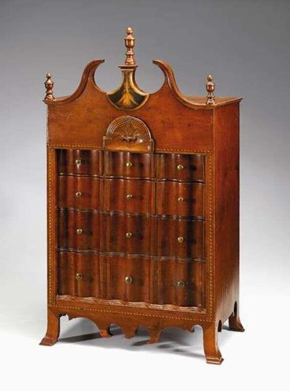 The molded and shaped cresting with three turned finals and incised and ebonized drop above inlaid case fitted with serpentine drawers, shaped skirt on French bracket feet.