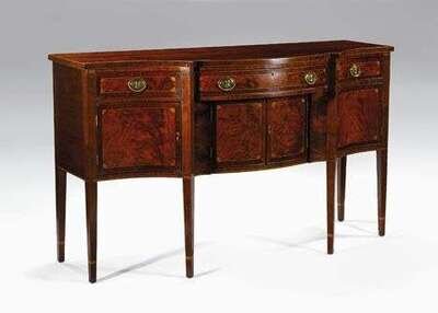 The serpentine top over a conforming case fitted with three drawers above a series of cupboard doors, all line-inlaid with fans to the corners, sawtooth inlaid frieze beneath, upon square tapered legs with striped capitals and line-inlaid ending in cuffs.