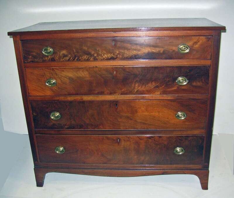 Rectangular top with reeded edge over four graduated cock beaded drawers flanked by reeded panels on French skirt, French bracket feet.