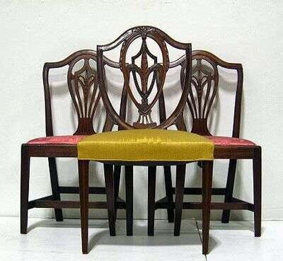 With arched crestrail, pierced urn splat; one with upholstered seat, two with slip seat.