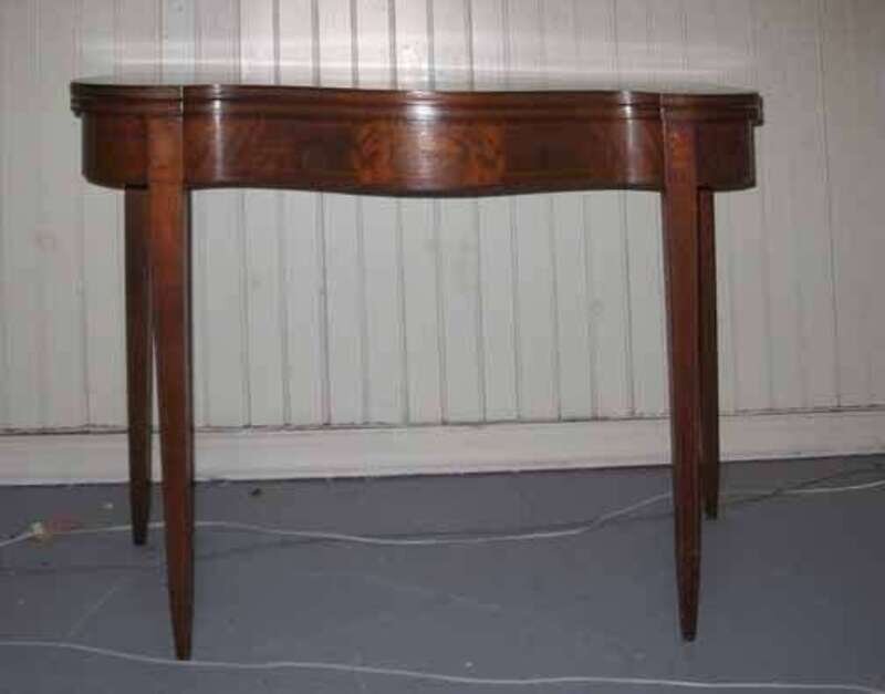 Demi-lune top with inlaid ends on conforming skirt inlaid with eagle and shield on squared tapering legs bellflower inlay.