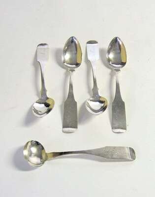 Each with fiddle handle, the tablespoons marked " J. Adam AlexR" and engraved "Morgan," the sauce ladle marked "Adam" and engraved "W.R. Skinker."