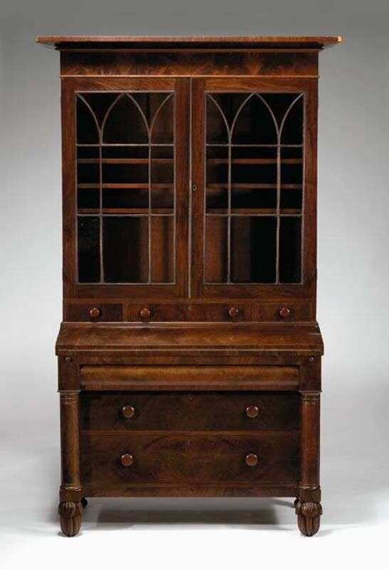 Late Classical mahogany secretary bears label of simon haines, new york, circa 1825