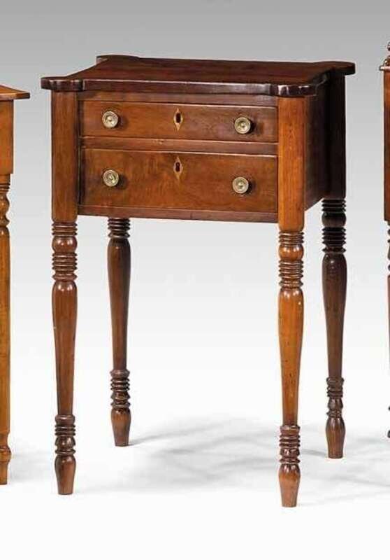 Rectangular top with outset corners above two drawers with three turned tapering legs.