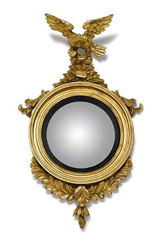 With a carved eagle with outstretched wings on a rocky support on molded frame, leafy carved pendant.