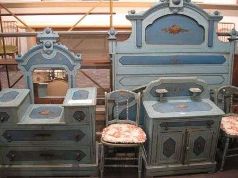 Including bed with paneled head and foot board, night stand with shaped back board and two candle shelves, dresser with two short and two long drawers and mirror and two chairs, all painted light blue, with darker blue shaped reserves enclosing polychrome flowers, two side chairs 2 side chairs.
