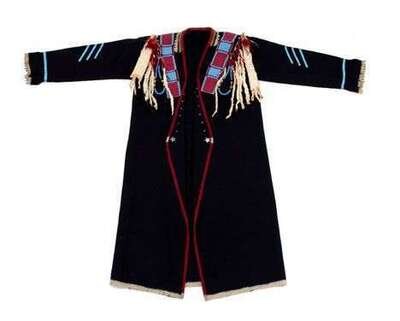 In the style of a frock coat of navy stroud cloth, decorated with seed-beads applied in spot-stitch or overlay technique and fringe of ermine.