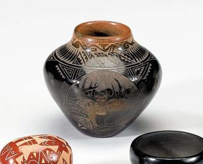 Santa Clara sgrafitto decorated seed jar signed "kevin naranjo povi pena santa clara pueblo"