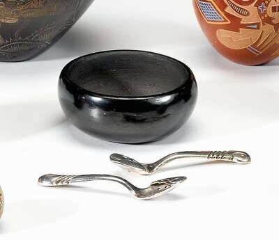 San ildefonso blackware salt dish and two silver spoons signed "rose" and "kb" for Kenneth Begay, circa 1950s,
