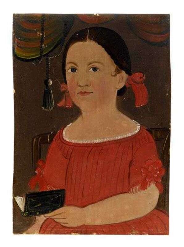 attributed to William Matthew Prior (1806-1873) portrait of a young girl in a red dress, holding a book
