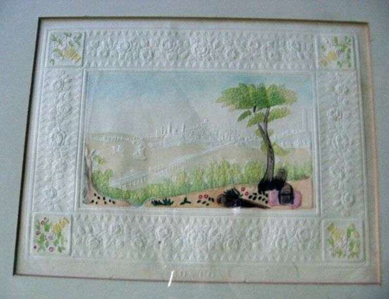 Rectangular form with floral embossed border enclosing embossed bird's eye view of Boston, hieghtened with hand coloring, framed.