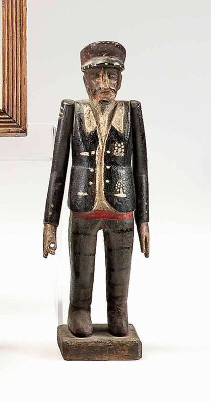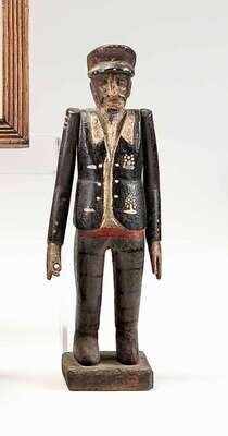 The standing figure of a Cockney street vendor with movable arms, the back with panel that lifts to reveal a heart.