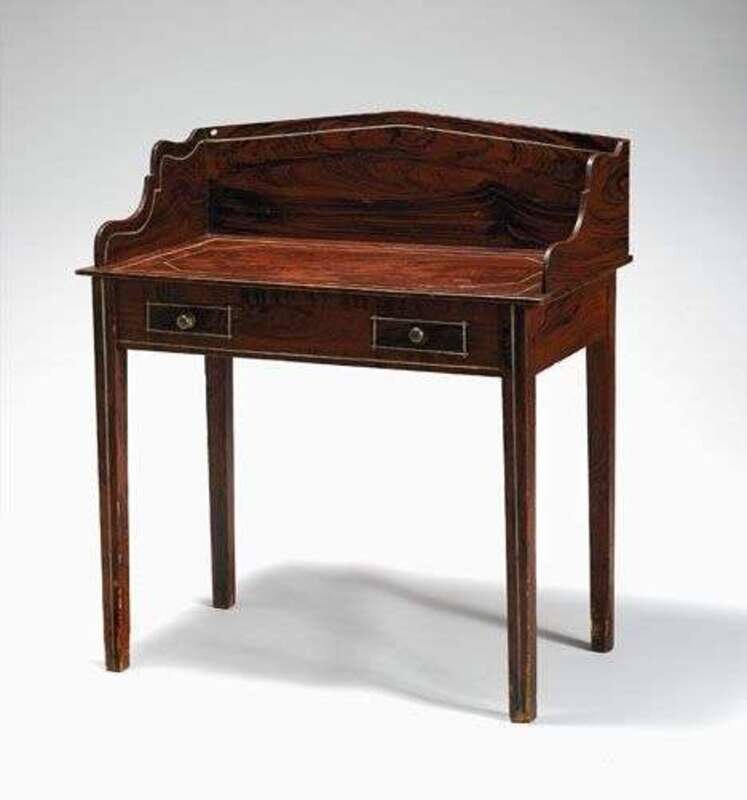 Triangular backboard and shaped gallery on rectangular top and two drawers, squared tapering legs, rosewood graining with white striping.