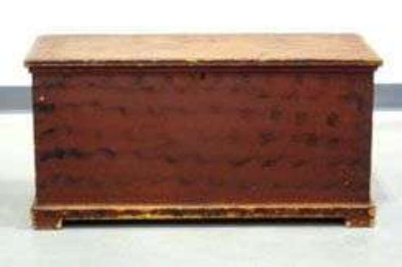 Rectangular form with molded lid opening to well with till, bracket base, painted red with black splotches.