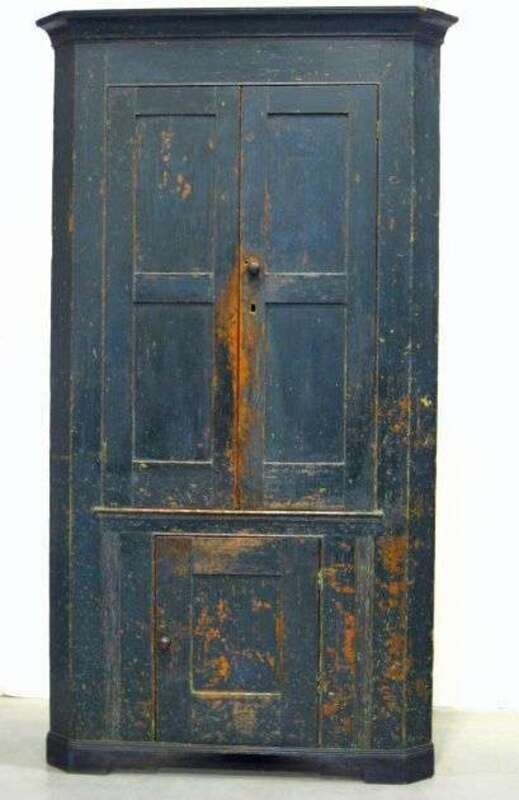 Flat reeded and coved molded corners above double blue recessed paneled doors and single recessed panel door flanked by reeded pilaster on shaped bracket base.