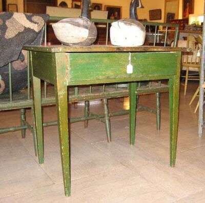 Rectangular top with bread board ends over single long drawer, square tapering legs.