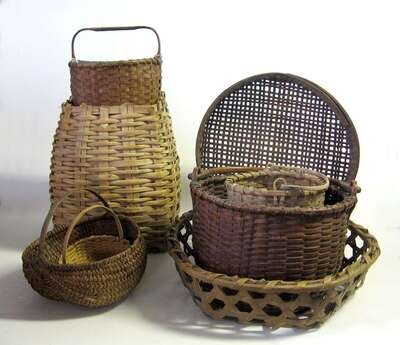 In variety of forms including cheese curd basket, tall gathering basket, three rounded baskets with rigid handle and two with shaped swing handle.