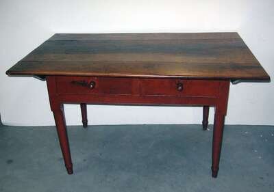 Rectangular three board top above two beaded drawers and tapering turned legs with ringed ankles.