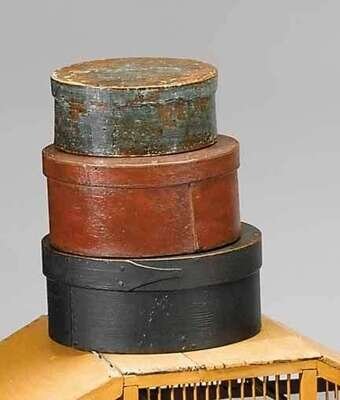 The largest painted dark green, the lid with single finger lap and branded "EK" the base with straight lap, the second box has red paint over green, with straight laps, the third box painted a worn blue-green, with straight laps.