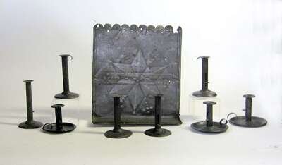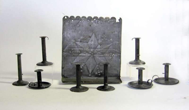 Including five hogscraper candlesticks, three tinware chamber sticks and a pierced tin hanging reflector shelf with scalloped edge and punchwork star.