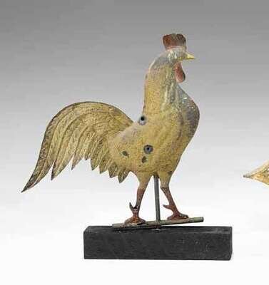 Full-bodied with sheet metal tail comb and wattle, traces of red paint to wattle, beak and legs, the body retains traces of boule.