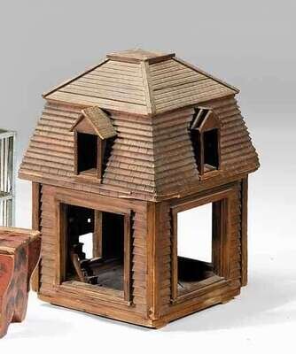 In the form of a square house with Mansard roof and dormer windows, weathered surface.