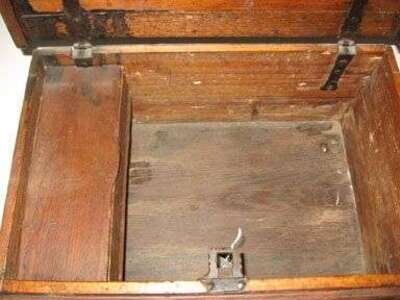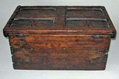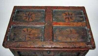 Of rectangular form with recessed paneled hinged lid lifting to well with covered till, paneled base, painted red, with black and yellow "bars" and black painted panels decorated with compass stars in red, black and yellow , white flowers at sides.