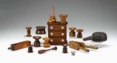 Including ten turned sanders, one turned inkwell, whistle, lemon press, a miniature three drawer chest with porcelain knobs, a carved and brass studded Continental powder flask, and a toddy stir.