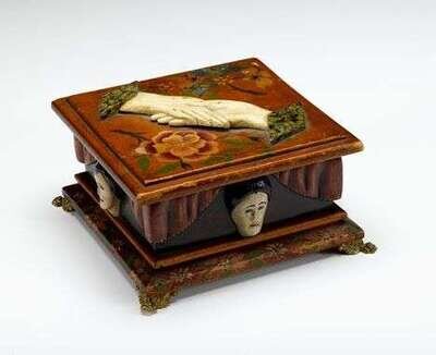 The squared, molded and hinged lid decorated with carved clasped hands and polychrome floral sprays on box carved with female faces enclosed by drapery on three sides, and diamond at back, molded base hand-painted with flowers, raised on cast metal feet.