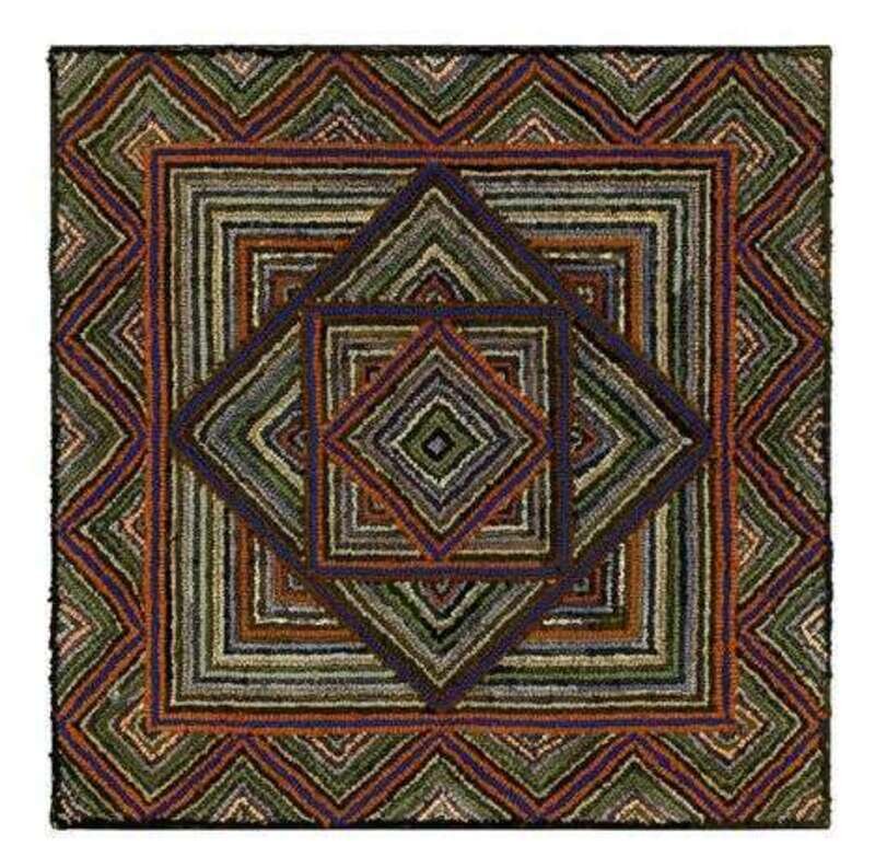 Square format with diamond within square pattern enclosed with a zig-zag border worked with printed and solid wool and cotton on a burlap ground, mounted for hanging.