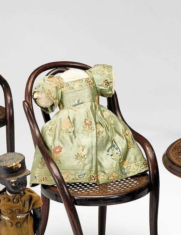 The dolls dress made of hand embroidered silk fabric, the bonnets mounted under glass.
