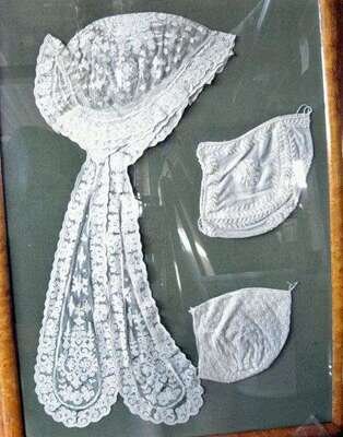 Dolls dress and three whitework bonnets 18th/19th century
