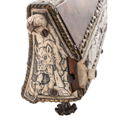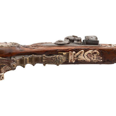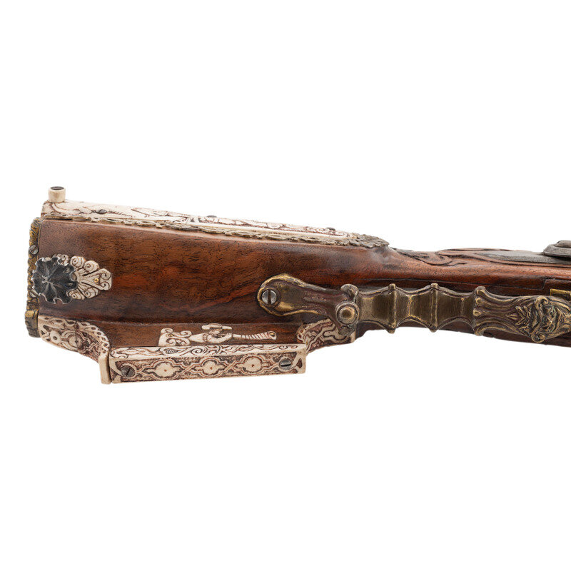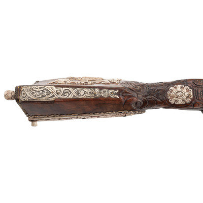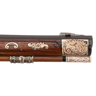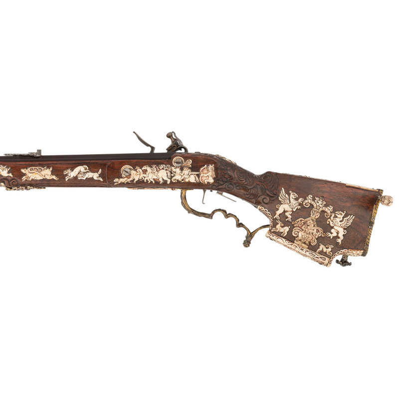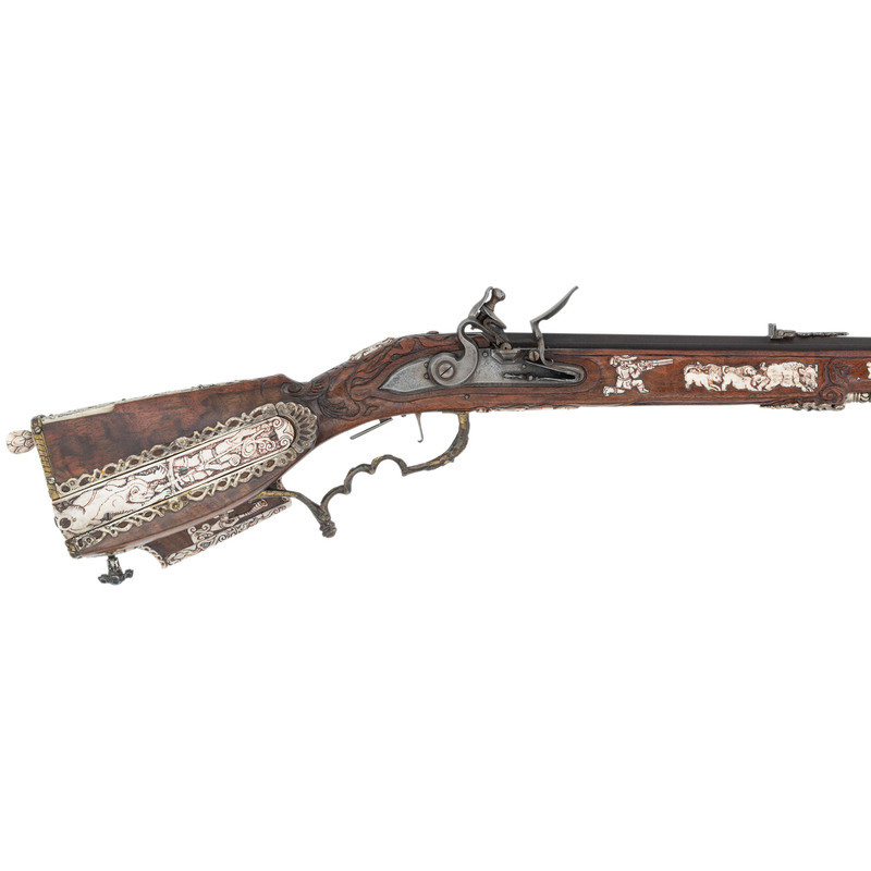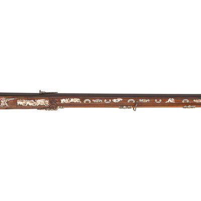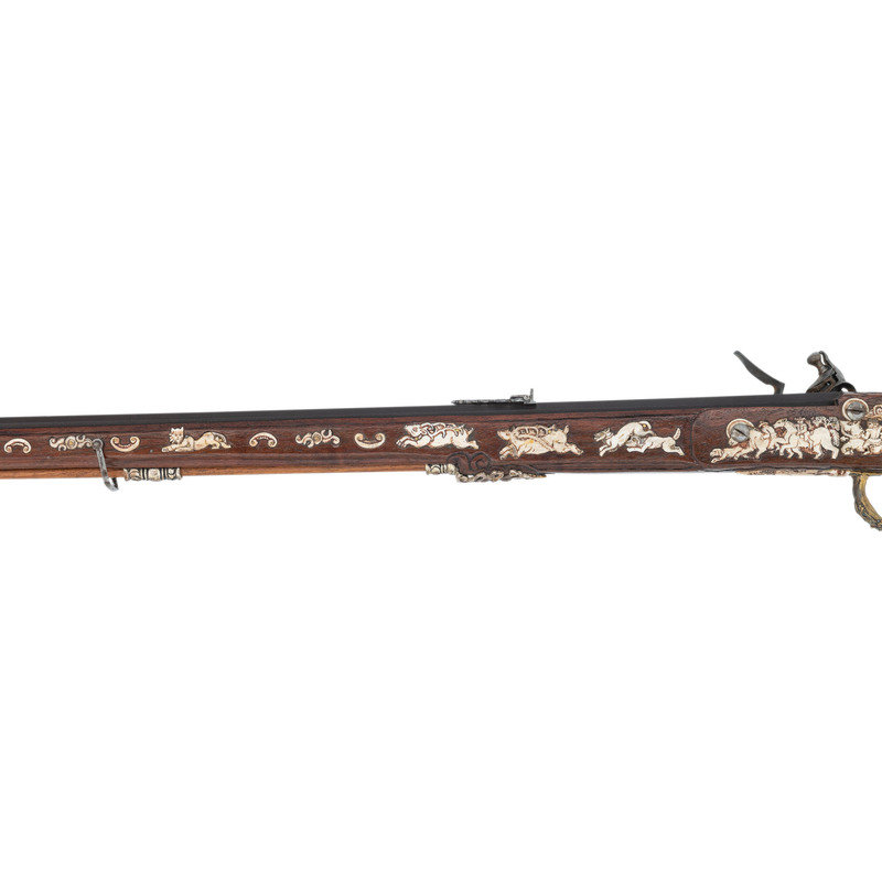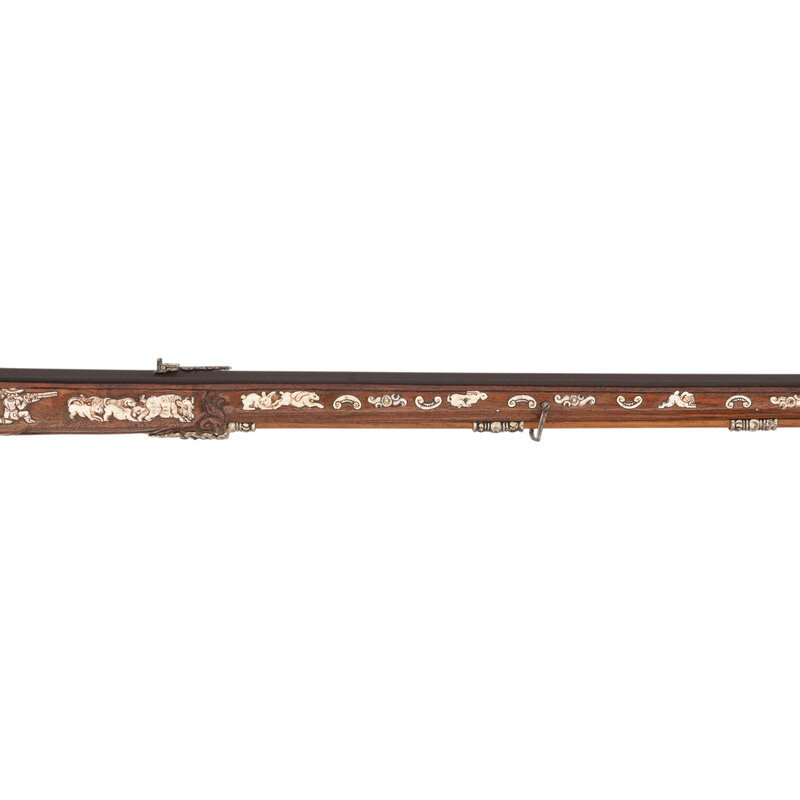 .40 caliber. 31" octagonal barrel length. SN: NSN. Browned metal finish. Bastogne walnut stock has rococo style carved grip and incised line to forearm. Flintlock rifle with two leaf folding notch rear sight and brass blade front sight. Lock is early Germanic according to consignor. Item features various carved elk antler stock fittings overall depicting hunting scenes, including a boar killing hunter on butt and hunting party scenes to both sides of forearm. Item also features a silver lined patchbox with enclosed cleaning rod attachment. Made around April 2005.