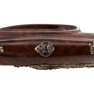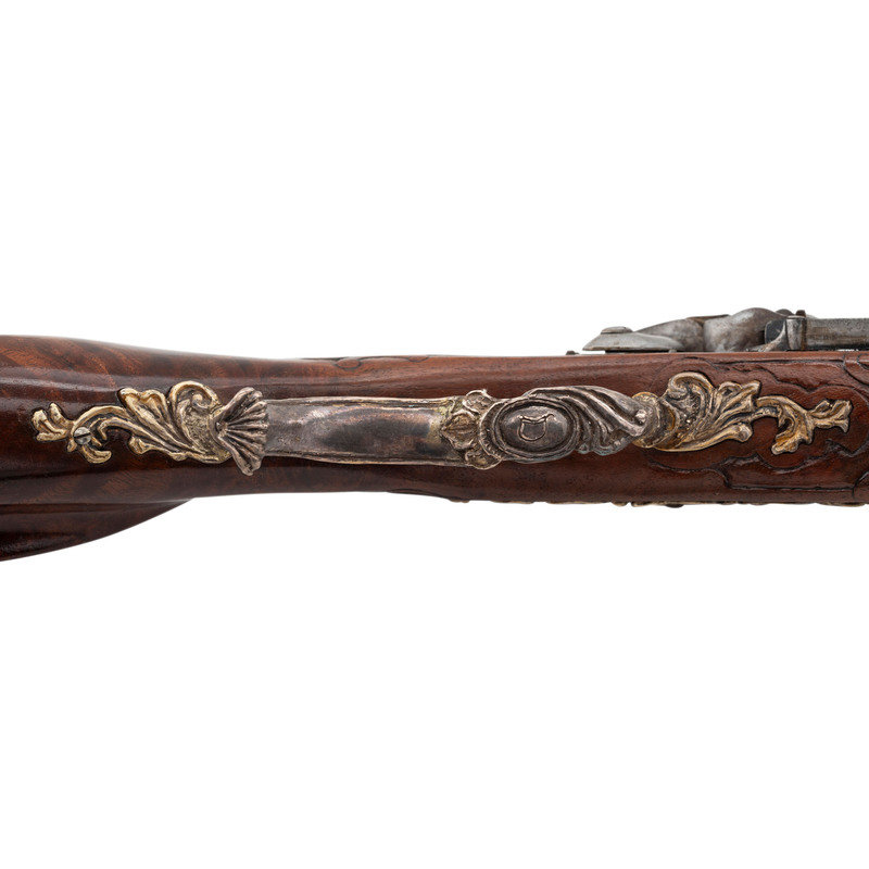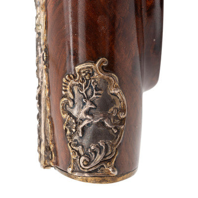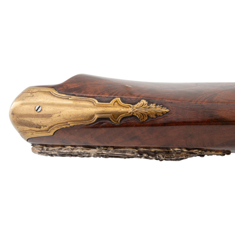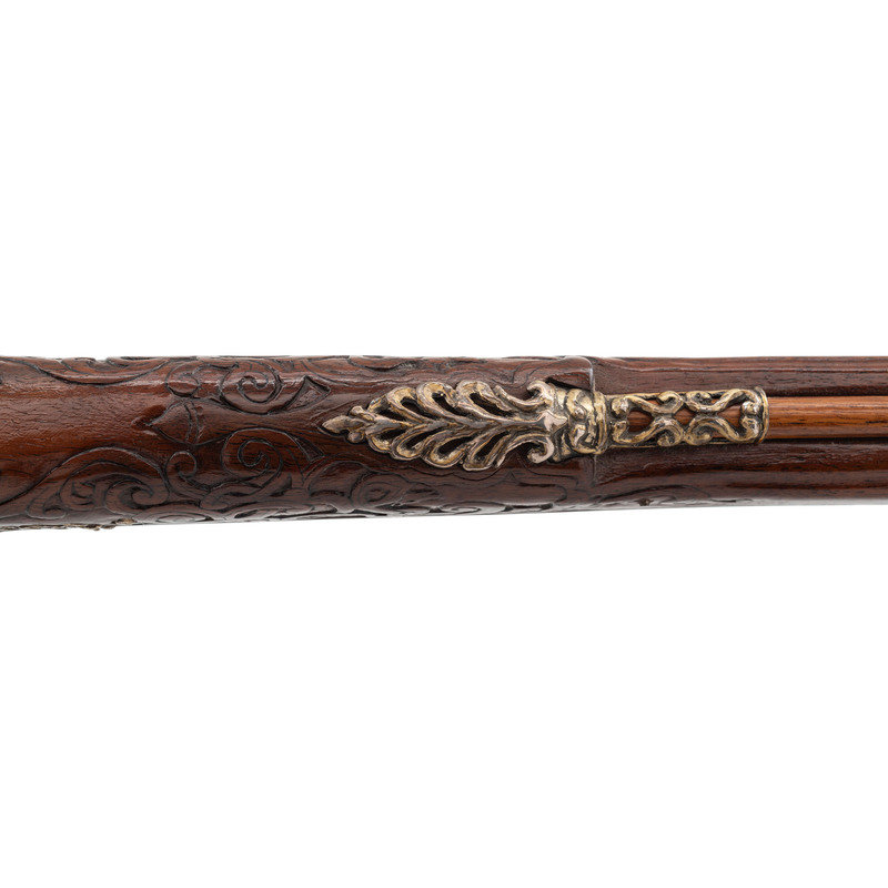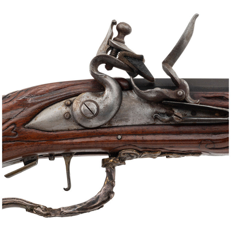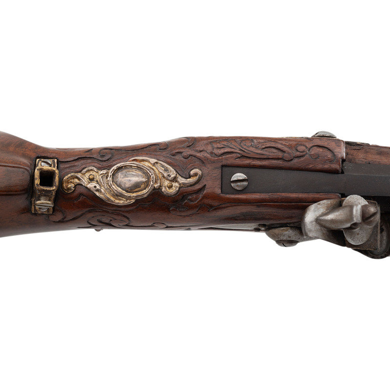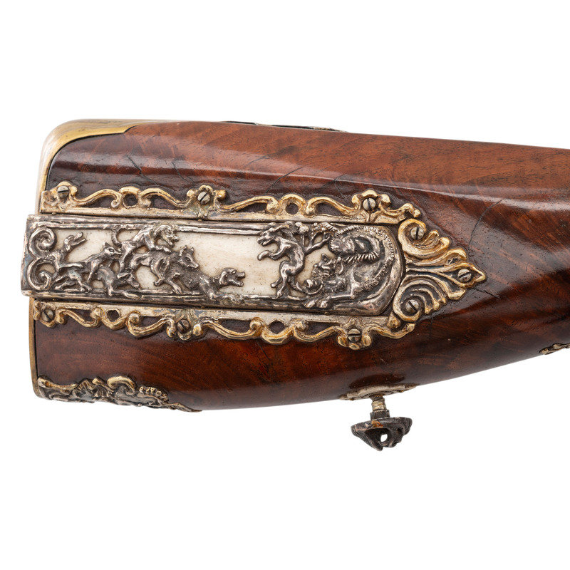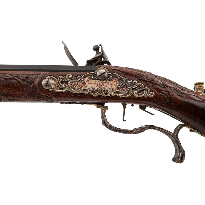 .40 caliber. 32" two stage octagonal to round barrel length. SN: NSN. Browned metal finish. Full length highly figured walnut stock has a perch belly butt, and carved rococo scroll to straight grip and forearm. Flintlock jaeger rifle with neoclassical notch rear sight and silver blade front sight. Item features double set triggers, sling swivels, and a patchbox on right side. Fittings include cast silver neoclassical vignette to top of wrist. Forearm has six filigree fittings and a staghorn forend cap. Sideplate fitting is filigreed cast silver surrounding a carved elk horn vignette showing a stag and hunter scene. Patchbox fittings include filigreed borders and a plain elk horn panel surrounded by cast silver filigree with scene of hounds attacking a boar. Buttplate has simple neoclassical style engravings. Bottom edge of stock has a filigree fitting with vignette of a prancing stag to toe, and a grotesque mask sling stud. Triggerguard is neoclassical style with a small vignette engraved with a D monogram. Ferrules are all cast silver in filigree style. Lock is Queen Anne style. Included with item is a wood ramrod with carved elk horn tip showing a devil grotesque, and ramrod attachment in patchbox. Wrist of item has a base for a hand made peep sight, but sight is not present.