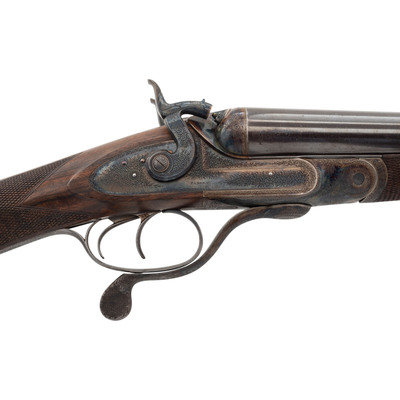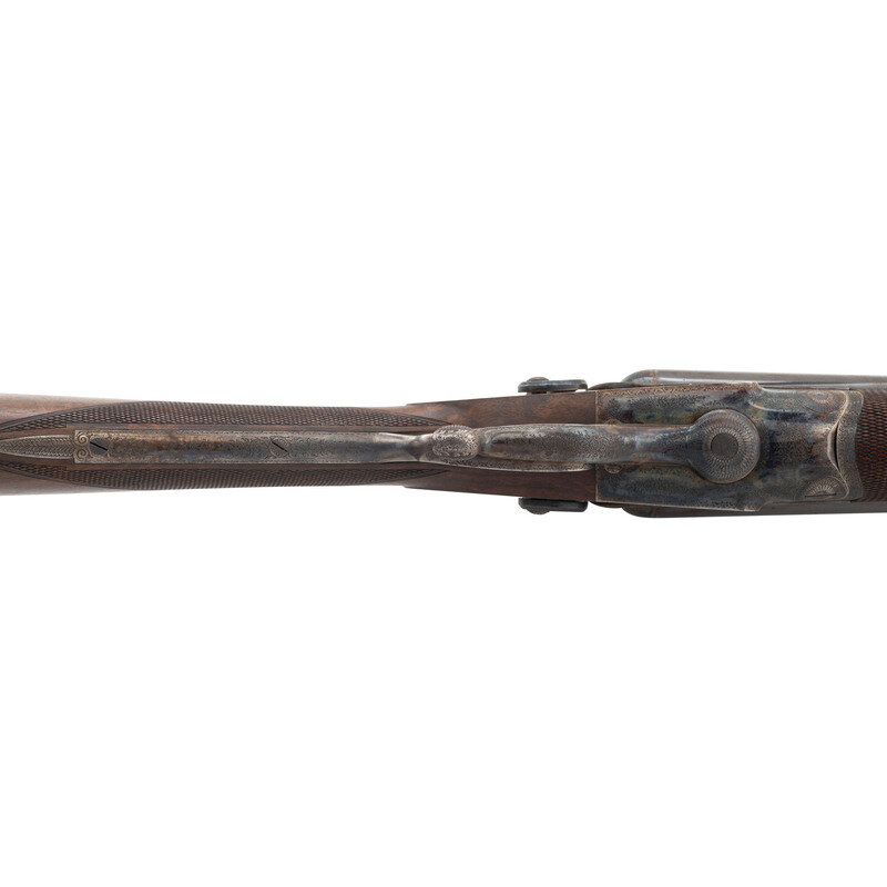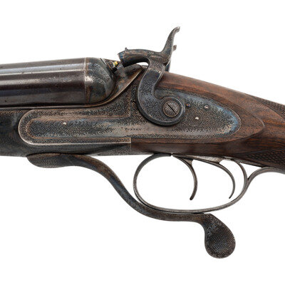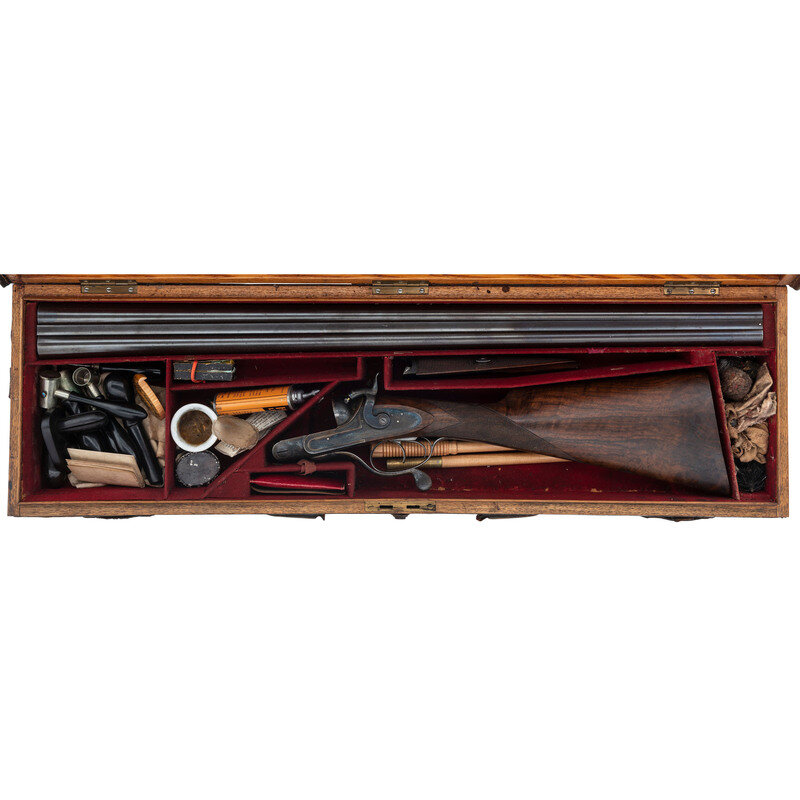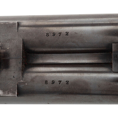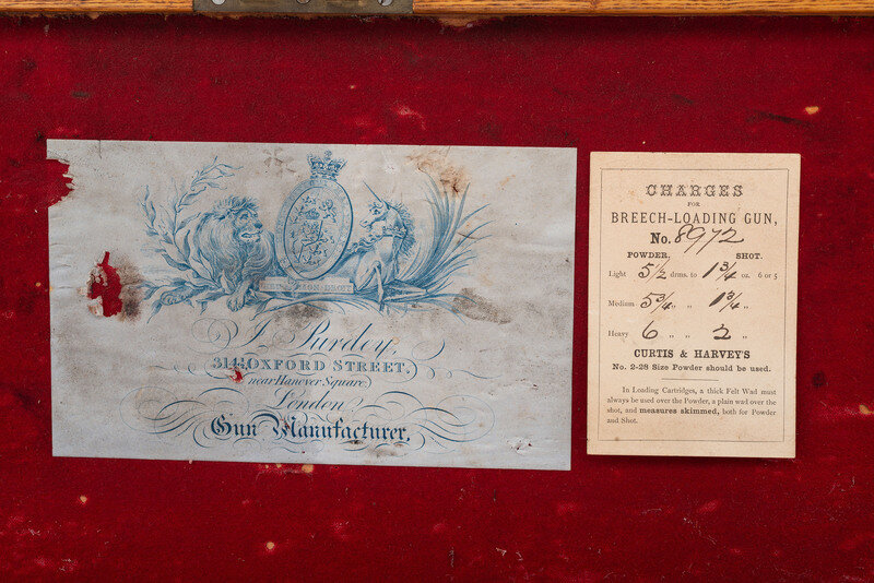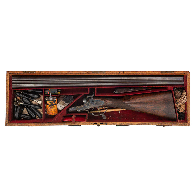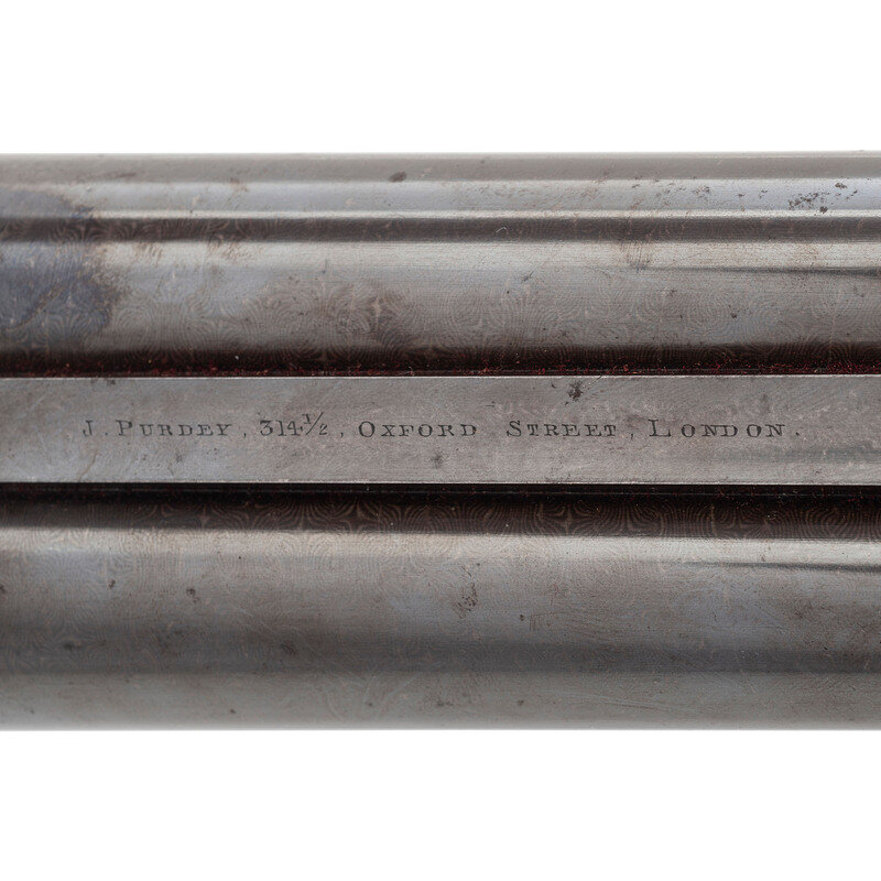 8 Gauge. 32.3" barrel length. SN: 8972. 0.83" chokes at both muzzles. 14.2" length of pull. 1.68" drop to comb. 3" drop to heel. Browned metal finish to the Damascus barrels with a casehardened frame mounted in an exposed hammer sidelock action with flat wrist English stock and splinter forend. Double barrel extractor shotgun with underlever action and mounting a naked butt with bordered checkering to the wood. The barrel rib is signed J. PURDEY, 314 1/2, OXFORD STREET, LONDON., with the flats showing Londing firing proof marks and 8 gauge markings to each barrel. Both barrel serial numbers match the frame, stock, and the forend. Further {Crown/V} London proofs appear to the watertables with both sidelocks signed PURDEY. The upper tang is marked PATENT within a border, and all parts of the frame display fine English style floral scroll engraving with floral embellishments to each bolt and screw head. The timing is off on the screws for the lower tang. Both hammers have fishmouth engraved embellishments above floral scrollwork, and the underlever features fine knurling to both sides. The toe of the stock mounts an oval silver escutcheon, and the wrist displays bordered two point engraving. The Key fastened splinter forend features engraved mountings and screws with English flat checkering overall. Item comes in a leather bound case with red velvet liner and a maker label and loading label to the lid. The maker label reads J. Purdey,/314 1/2 OXFORD STREET./near Hanover Square/London/Gun Manufacturer. Included in the case are: a pamphlet entitled DIRECTIONS FOR PURDEY's CENTRAL-FIRE BREECH LOADERS CHARGE AND DIRECTIONS FOR LOADiNG CENTRAL-FIRE CARTRIDGES published in 1872, assorted powder measures and chisels, handwritten directions for installing a spare pin, cardboard box with pin wrapped in paper, two lengths of wood cleaning rod, assorted bore mops and brushes, and a Hoppe's No. 9 tin with instructional pamphlet.