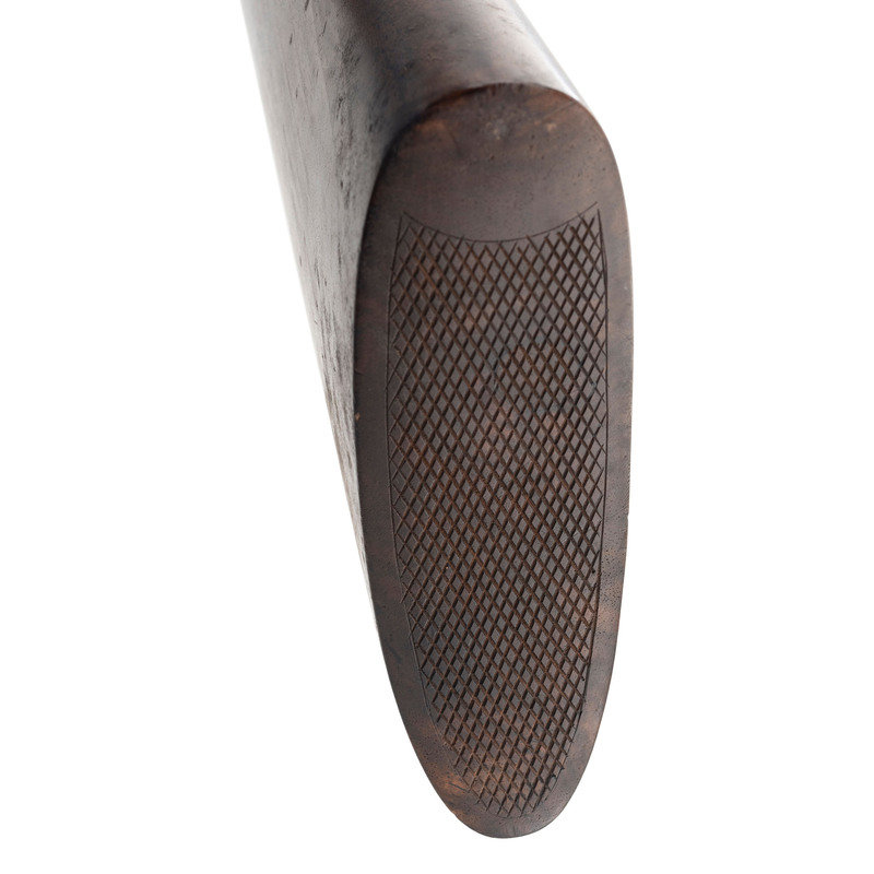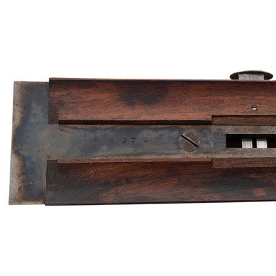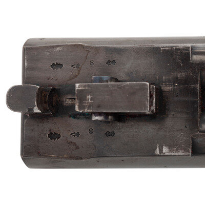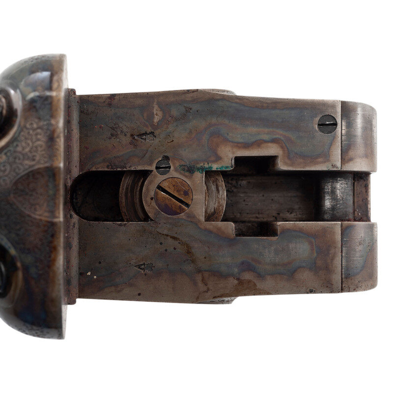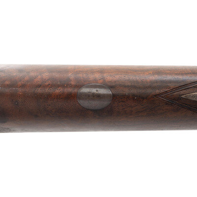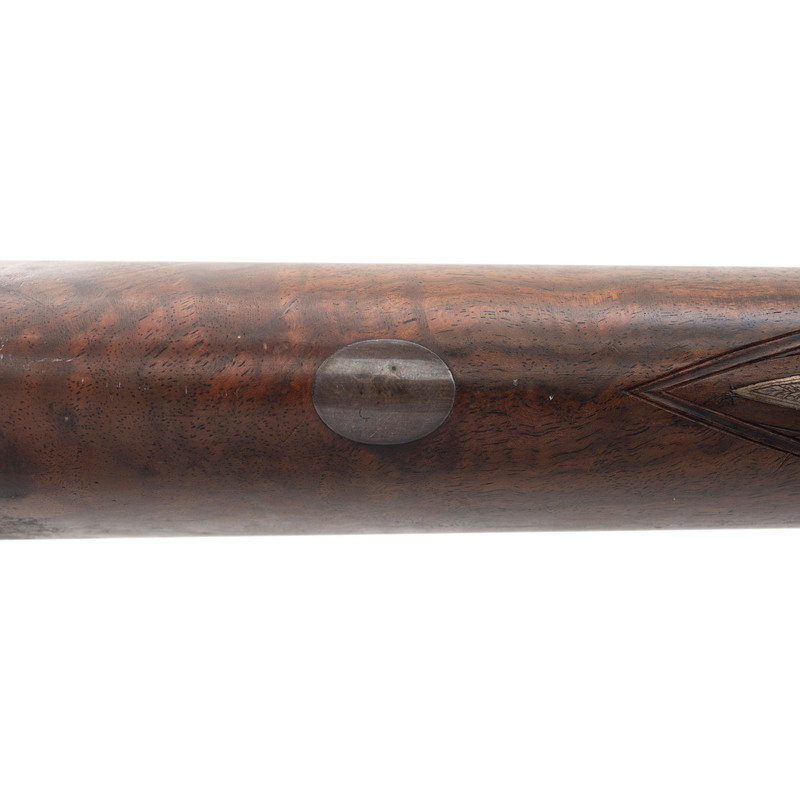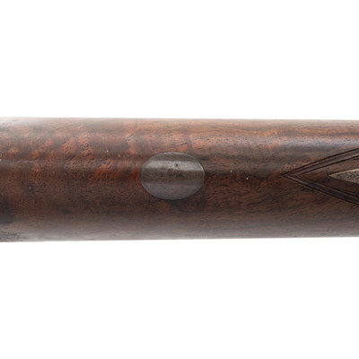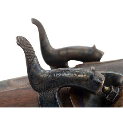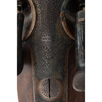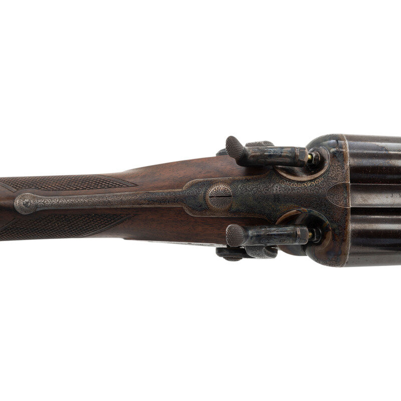 8 Gauge. 32.3" barrel length. SN: 8972. 0.83" chokes at both muzzles. 14.2" length of pull. 1.68" drop to comb. 3" drop to heel. Browned metal finish to the Damascus barrels with a casehardened frame mounted in an exposed hammer sidelock action with flat wrist English stock and splinter forend. Double barrel extractor shotgun with underlever action and mounting a naked butt with bordered checkering to the wood. The barrel rib is signed J. PURDEY, 314 1/2, OXFORD STREET, LONDON., with the flats showing Londing firing proof marks and 8 gauge markings to each barrel. Both barrel serial numbers match the frame, stock, and the forend. Further {Crown/V} London proofs appear to the watertables with both sidelocks signed PURDEY. The upper tang is marked PATENT within a border, and all parts of the frame display fine English style floral scroll engraving with floral embellishments to each bolt and screw head. The timing is off on the screws for the lower tang. Both hammers have fishmouth engraved embellishments above floral scrollwork, and the underlever features fine knurling to both sides. The toe of the stock mounts an oval silver escutcheon, and the wrist displays bordered two point engraving. The Key fastened splinter forend features engraved mountings and screws with English flat checkering overall. Item comes in a leather bound case with red velvet liner and a maker label and loading label to the lid. The maker label reads J. Purdey,/314 1/2 OXFORD STREET./near Hanover Square/London/Gun Manufacturer. Included in the case are: a pamphlet entitled DIRECTIONS FOR PURDEY's CENTRAL-FIRE BREECH LOADERS CHARGE AND DIRECTIONS FOR LOADiNG CENTRAL-FIRE CARTRIDGES published in 1872, assorted powder measures and chisels, handwritten directions for installing a spare pin, cardboard box with pin wrapped in paper, two lengths of wood cleaning rod, assorted bore mops and brushes, and a Hoppe's No. 9 tin with instructional pamphlet.