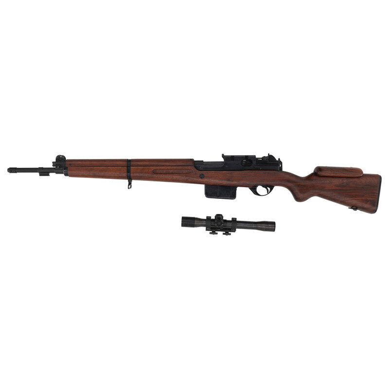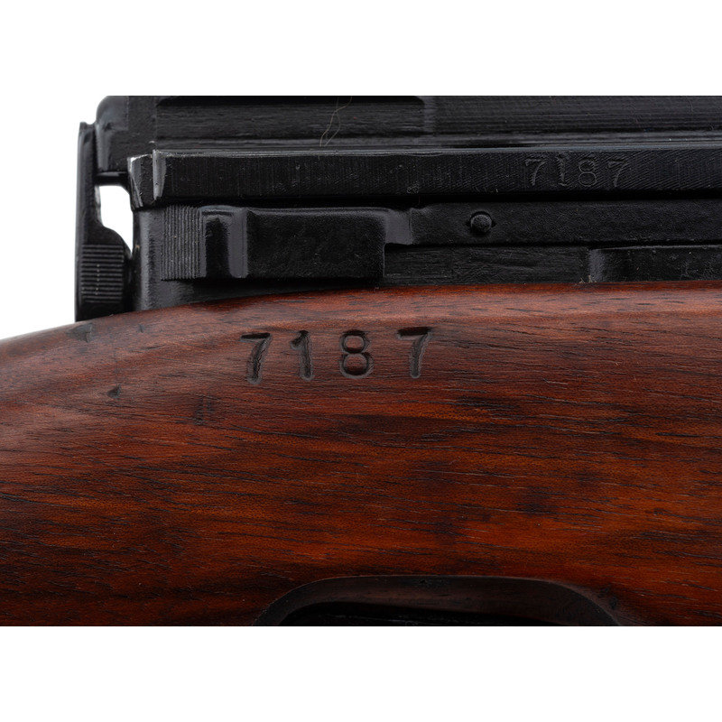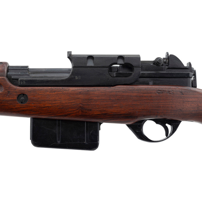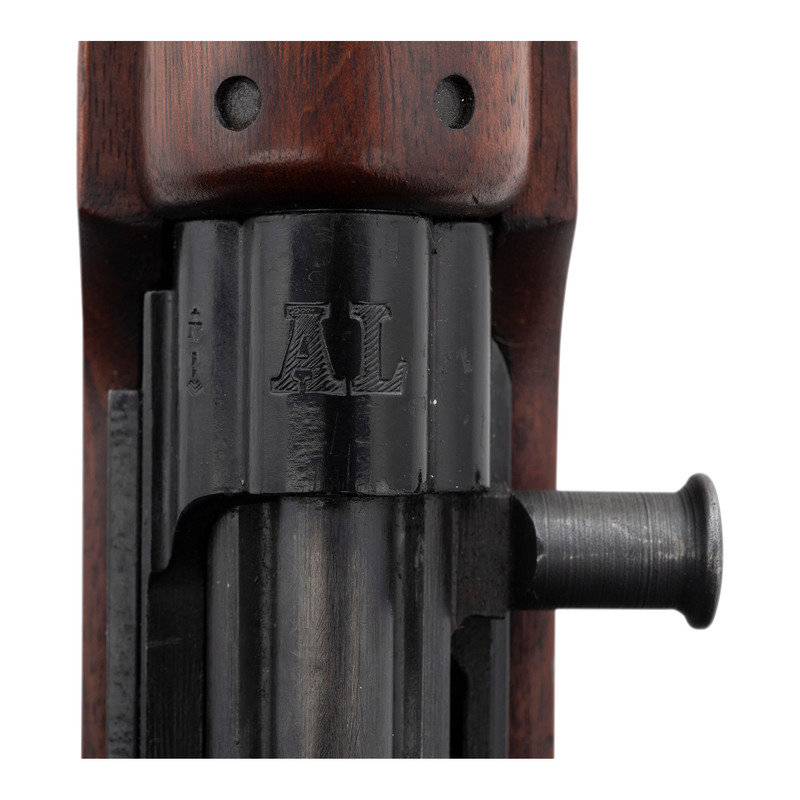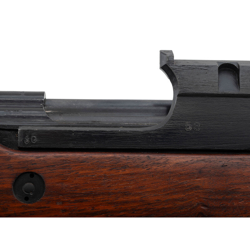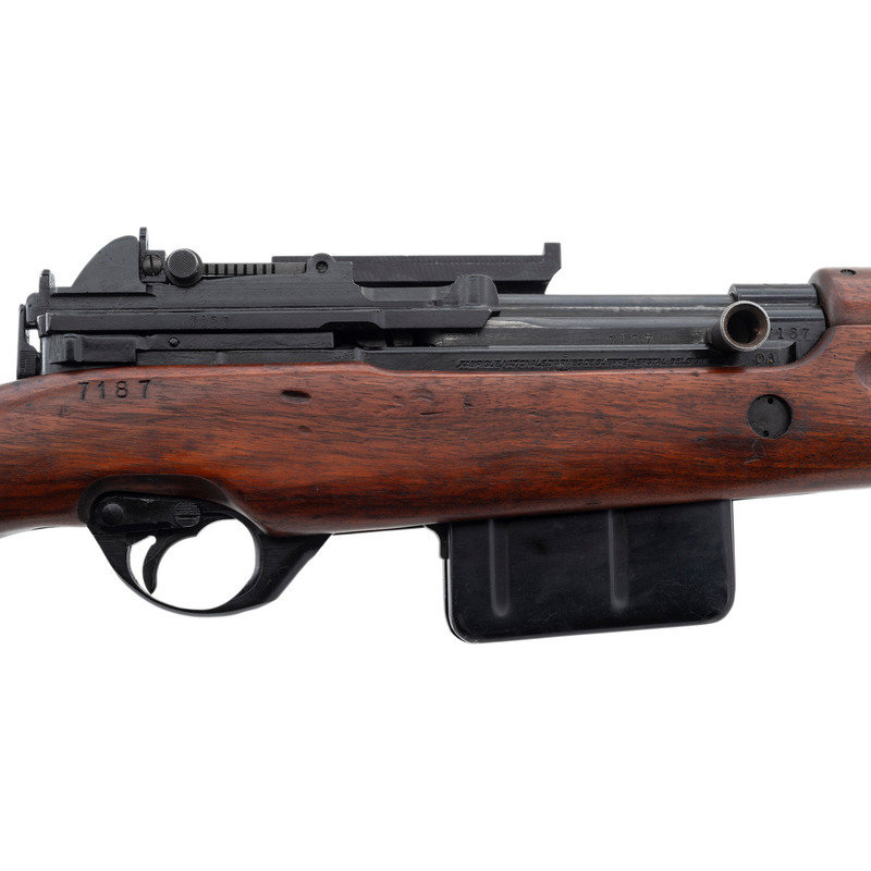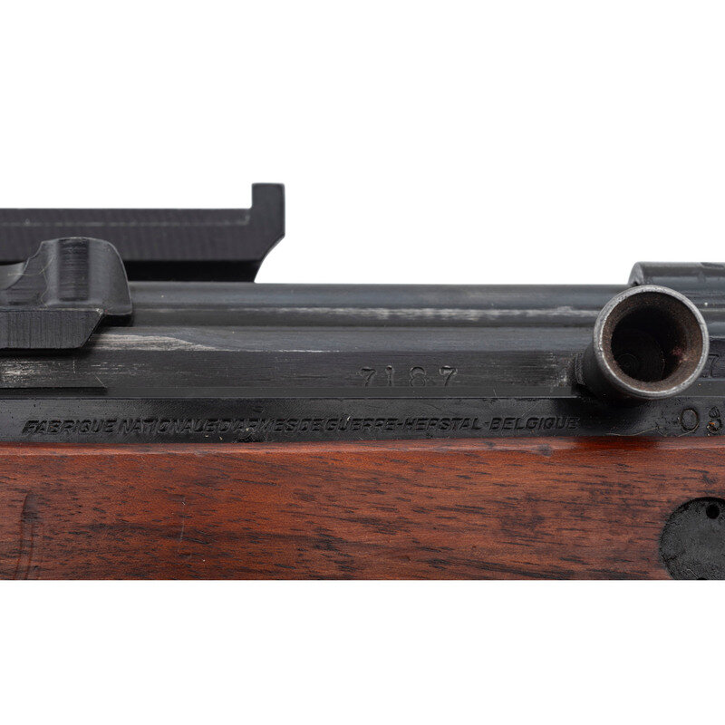 .30-06. 23.2" barrel length. SN: 7187. Black Parkerized and painted finish with walnut semi pistol grip stock mounting a detachable cheek piece and a full length upper handguard retained by two barrel bands. Short stroke piston gas operated rifle utilizing a tilting bolt design and a scope mount affixed to the left receiver. The top of the receiver shows the AL marking indicative of the Luxembourg contract, along with the {Crown/N} and {Le Perron} proof markings. Further firing proofs visible on the bolt carrier and bolt. The right receiver is marked VABRIQUE NATIONALAE D'ARMES DE GUERRE-HERSTAL-BELGIQUE. The serial numbers on the receiver, the stock, bolt carrier, bolt, and receiver cover match. The assembly number 08 appears on the right receiver and the left edge of the scope mount. Scope mount is additionally marked 58. Comes with a telescopic sight mounted to the correct scope mount marked ECHO/E. C. HERKNER CO./BOISE. IDAHO. The scope itself is marked A.B.L.-1951/V5-0S 784-010B.G./TIR.EL.TELESC.SCHERPSCH./No1047. Scope comes in a matching leather carrying case with leather lens covers. Neither the case nor the lens covers show manufacturer markings. The trapdoor butt is void of tools. It is estimated that Luxembourg received fewer than 10,000 FN-49 pattern rifles under contract from FN, with fewer still completed as factory sniper rifles. The item is essentially mechanically identical to a standard FN-49 save for the addition of the scope, mounting, and the cheek rest.