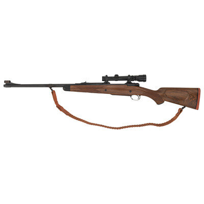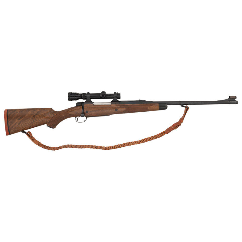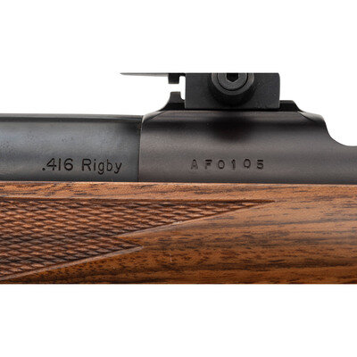 .416 Rigby. 24" barrel length. SN: AF0105. Parkerized metal finish. AA English walnut stock has a cheek rest to left side, ebony forend, and checkering to semi pistol grip and forearm. Bolt action rifle with express notch rear sight, hooded blade front sight, and a Redfield 1-4x20mm scope. Item features an internal box magazine, trapdoor grip cap, rubber recoil pad, and woven brown leather sling.