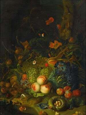 FOLLOWER OF RACHEL RUYSCH (DUTCH 1664-1750) STILL LIFE WITH APPLES, PEARS, GRAPES, CORN, POMEGRANATES, A BIRD'S NEST WITH EGGS, BUTTERFLIES, A LIZARD AND INSECTS IN A WOODLAND SETTING