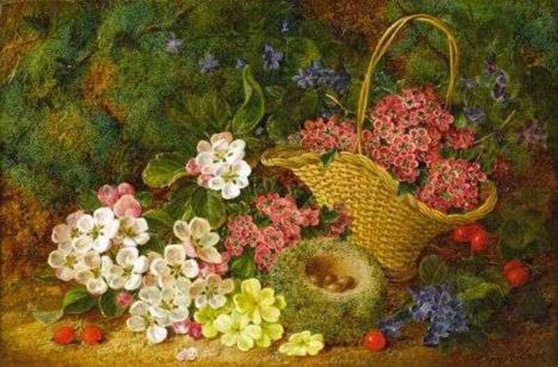 GEORGE CLARE (BRITISH 1830-1900) FLOWERS IN A BASKET AND EGGS IN A NEST ON A MOSSY BANK