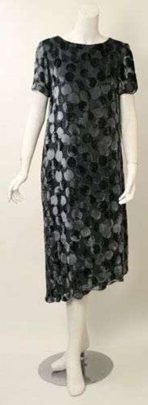 Slate grey silk chiffon with flocked dot pattern, shaded by darker metallic threads, with short sleeves and a rounded neckline, falling in a sheath to the calf, scalloped hem. Fully lined, labeled "Holly Harp," size small.
