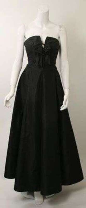 Full-length full-skirted ball gown with a fitted, strapless bodice with bow and jeweled-button detail at the bust. Labeled "Oscar de la Renta," size 12.