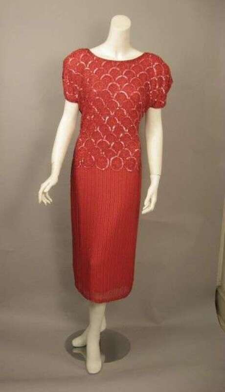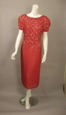 Wode scoop nackline and cap sleeves., with a scallop-pattern in ponk sequins and red glass bugle beads on the bodice, the skirt with beaded vertical stripes. Labeled "Oleg Cassini," etc., size 12.
