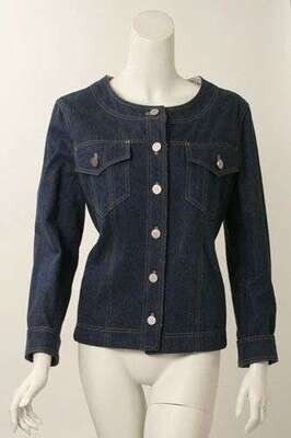 Classic styling in medium indigo cotton denim with flap pockets and round collar, button cuffs, lined in black and white cotton blend boucle.